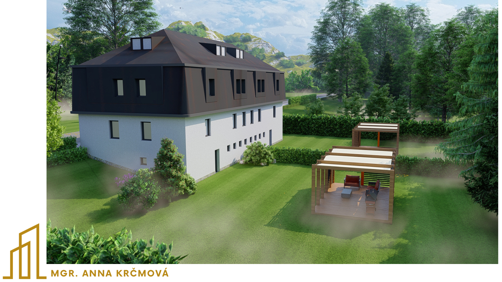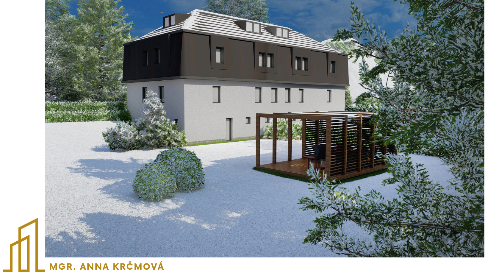 K domu náleží zahrada v zadní klidové části za domem, kde bude vytvořen prostor pro venkovní posezení, grilování apod.